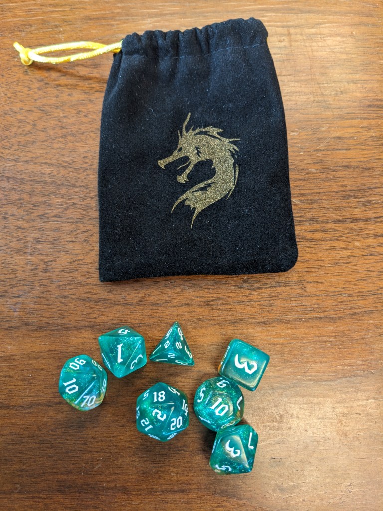 The Gold Dragon dice bag was a nice addition. It’s always good to have somewhere to store your dice. You can fit 2 full sets of dice inside. The material is soft, but a little stiff. They call it “flannelette”. The drawstring feels a bit cheap. Both are synthetic fibers and I would have preferred something more natural. It does sport that beautiful dragon logo though! It’s not my favorite dice bag, but it works. It’s a nice item to have so that I can quickly pull out a complete set from my large bag-o-dice. They run $7 on the Dice Dragons website.