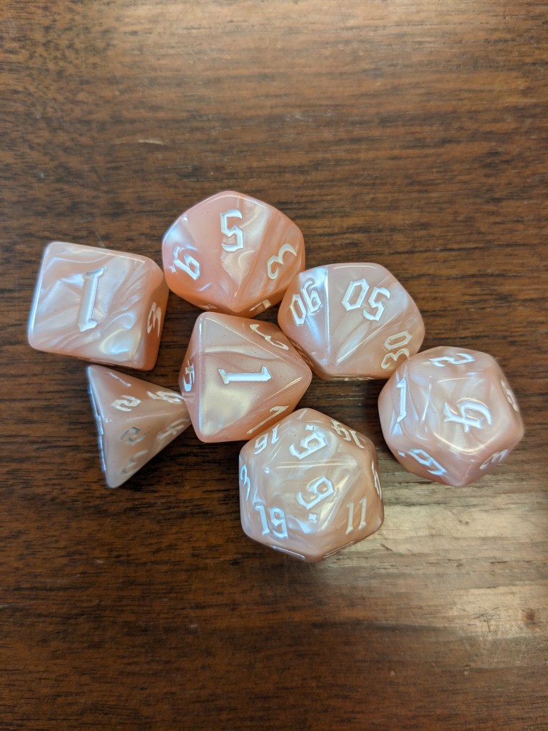 First off, the dice look great. Personally, I really enjoyed the look of the Ethereal Teal set. The font used for the numbering on the dice is fancy enough to be interesting and clear enough to be legible, which is a lot harder to find on dice than it sounds. The sparkles and whorls in the dice make them beautiful both on the table and in the dice trays. I do wish the coloring of the numbers was something other than white, especially on the pink pastel dreams set.